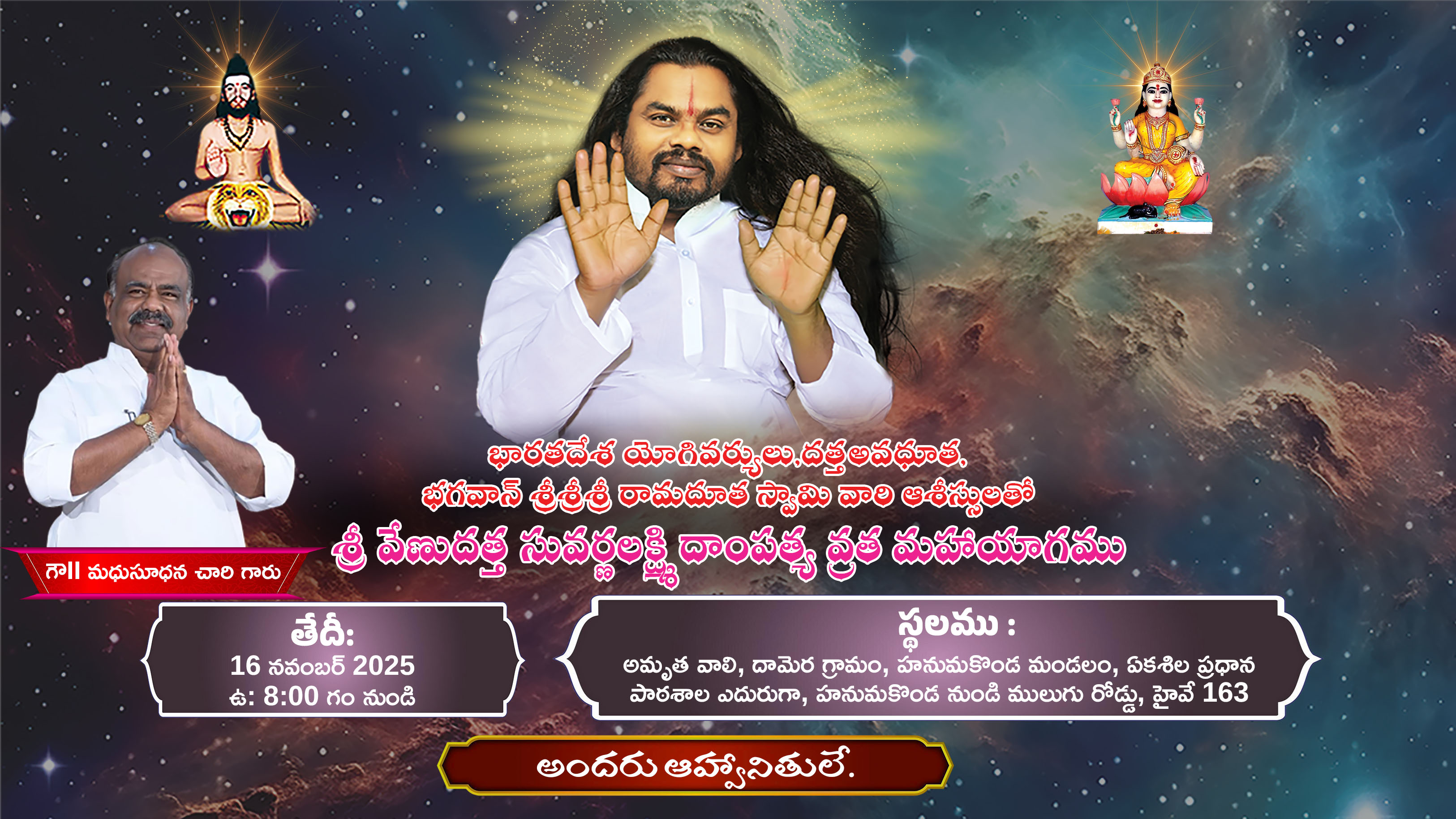 భారతదేశ యోగివర్యులు,దత్తఅవధూత, భగవాన్ శ్రీశ్రీశ్రీ రామదూత స్వామి వారి ఆశీస్సులతో శ్రీ వేణుదత్త సువర్ణలక్ష్మి దాంపత్య వ్రత మహాయాగము కార్య క్రమాసంతరము అన్న ప్రసాదమును స్వీకరించగలరు ఈ యజ్ఞములో పాలుగొనుటకు ప్రవేశం ఉచితం. పూజ సామగ్రి ఉత్సవ వాటిక యందు ఉచితంగ అందజేయబడును. అందరు ఆహ్వానితులే.
